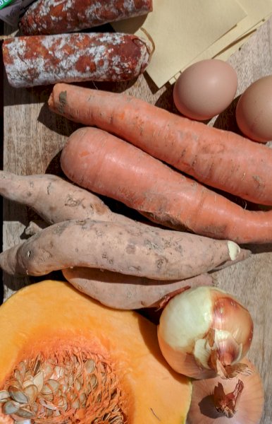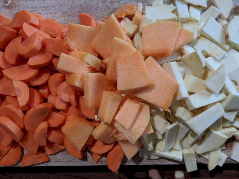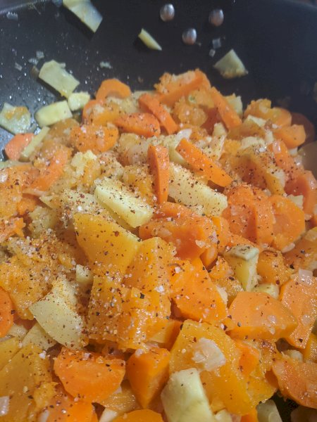 Taillez courge, patate douce et carotte en tronçons, les ajouter aux oignons. Les faire cuire 30 minutes avec un verre d'eau à couvert! En fin de cuisson bien retirer le surplus d'eau!