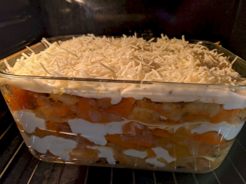 Une fois tout prêt, disposer les pâtes à lasagne au fond du plat, puis une couche de légumes-chorizo, puis de la béchamel et ainsi de suite afin de réaliser plusieurs couches!