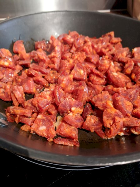Pendant ce temps, couper le chorizo en petits morceaux et les faire revenir