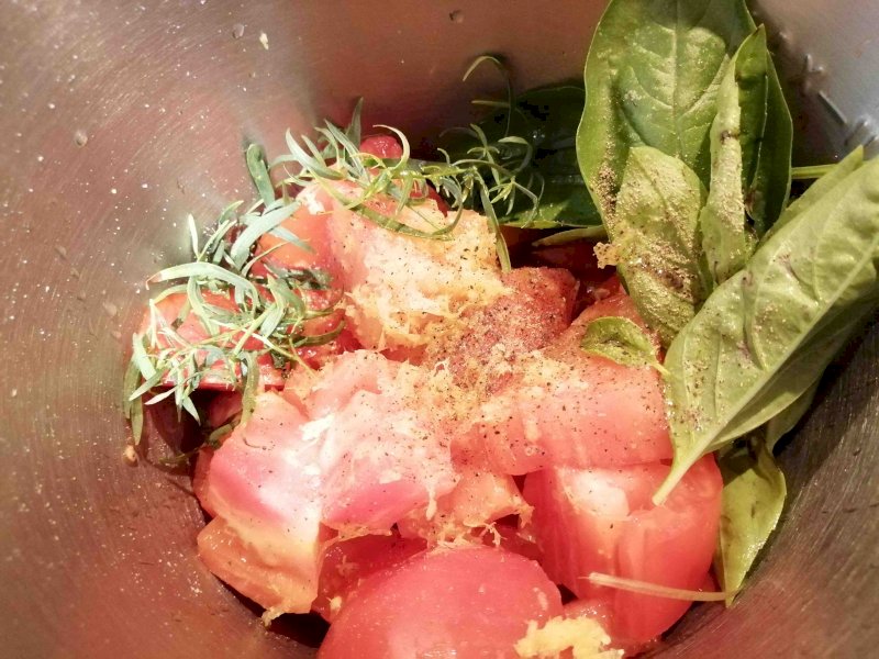 Ajouter votre basilic environ 10-15 feuilles, l'huile d'olive, sel, poivre...