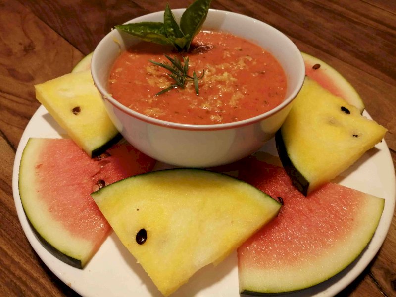 Détaillez vos tomates, oignon, poivron, et pastèque en morceaux.