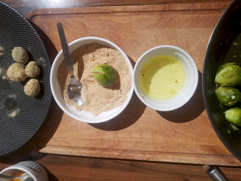 Prendre un par un les choux de Bruxelles les tremper dans du blanc d’œuf puis dans la panure.
