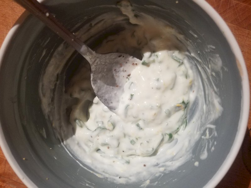 Pendant ce temps préparer dans un bol 3 cuillères a soupe de yaourt de brebis, râper un zeste de citron et du gingembre, un peu d'aillet et de cebette, quelques feuilles de coriandre hachées.